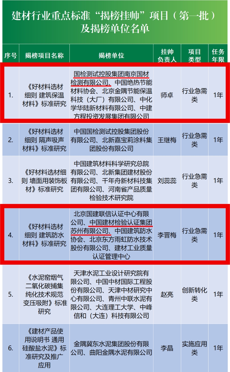 近日,中国建筑材料联合会印发《关于公布建材行业重点标准“揭榜挂帅”项目(第一批)及揭榜单位名单的通知》(中建材联标函〔2026〕6号),正式下达了建材行业重点标准研制计划。国检集团华东材料事业部旗下苏州公司与南京国材公司凭借在建筑防水及保温材料检测领域的深厚积淀,成功揭榜两项关键标准研制任务。